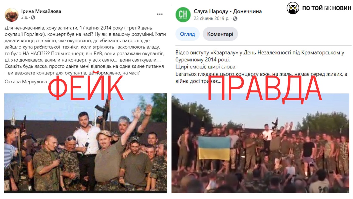 У соцмережах і на проросійських сторінках поширюється фото, де Володимира Зеленського зображують нібито серед «ополченців» у Горлівці у 2014 році. Це маніпуляція. Насправді світлина зроблена у Краматорську на День Незалежності України, 24 серпня 2014 року, під час концерту «95 кварталу» для українських військових.